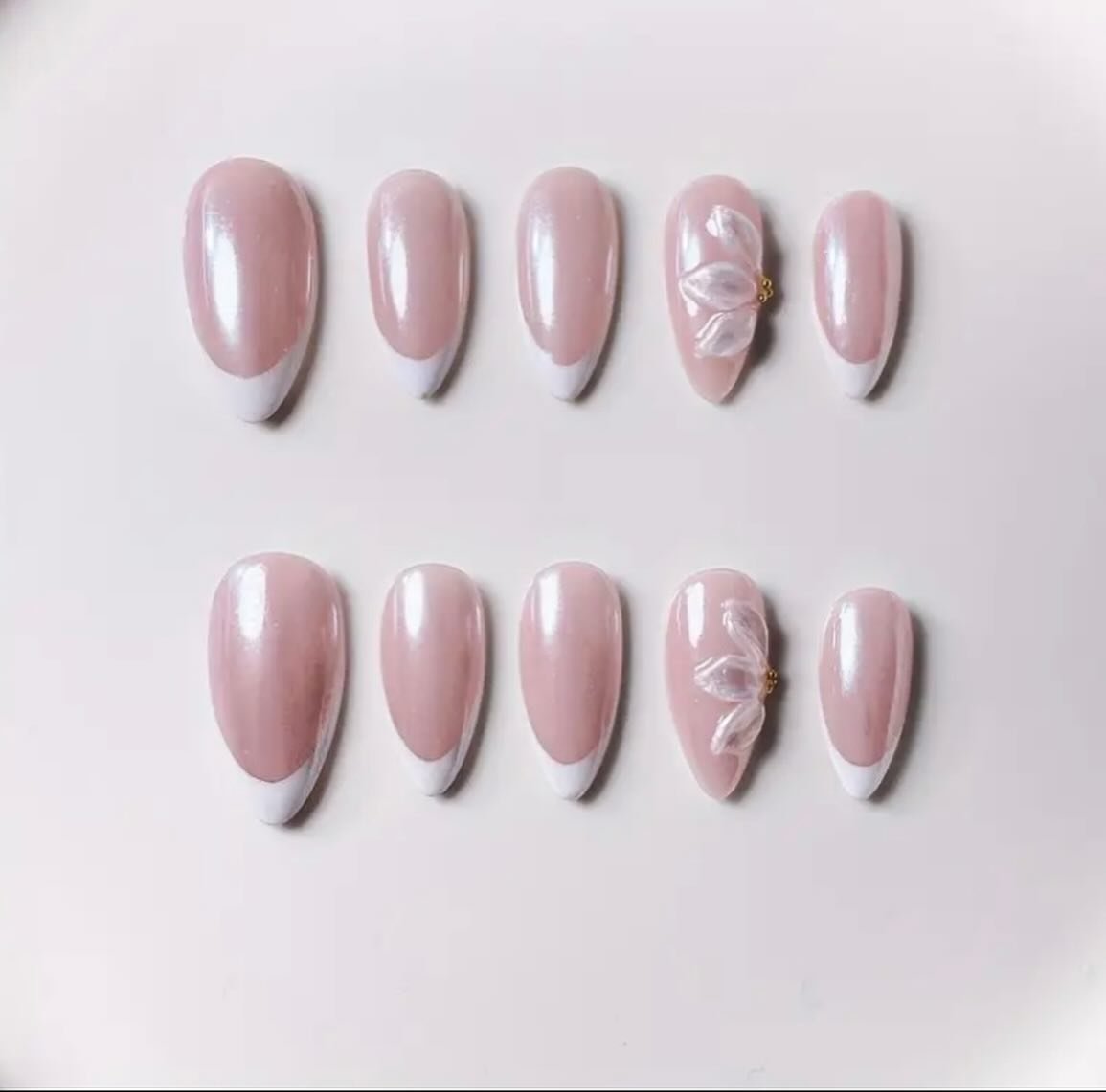 Apportez une touche de douceur et d’élégance à vos mains avec ces ongles French nude ornés d’une fleur 3D délicate. Leur base nude brillante, associée à une pointe blanche classique et à un détail floral raffiné, crée un look chic, naturel et féminin.